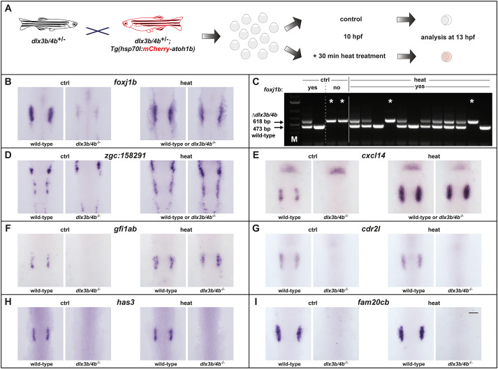 Ectopic Atoh1b rescues gene expression in the OEPD in the absence of Dlx3b/4b. (A) Scheme of the experimental outline. Progeny were obtained from heterozygous animals carrying the dlx3b/4b deletion allele (dlx3b/4b+/−) crossed with animals carrying the dlx3b/4b deletion allele as well as the transgene to misexpress atoh1b conditionally [dlx3b/4b+/−;Tg(hsp70l:mCherry-T2a-atoh1b)], both in heterozygosity. At 10 hpf, the clutch was split and either treated with heat or served as untreated control. At 13 hpf, corresponding to late OEPD stages, heat-treated embryos were sorted for mCherry fluorescence and subsequently fixed for analysis just as untreated controls. (B) In untreated controls (ctrl), foxj1b is robustly expressed in the majority of the embryos (wild-type) whereas one quarter displays a significant downregulation (dlx3b/4b−/−). In contrast, all heat-treated embryos (heat), show a widespread foxj1b expression, even extending the common OEPD territory. (C) Multiplex PCR reveals the genotype of individual embryos following in situ hybridization. dlx3b/4b mutants are indicated with an asterisk. Two embryos of untreated controls with a strong foxj1b expression carry the wild-type allele detected with a 473 base pairs (bp) amplicon in homozygosity or in combination with the dlx3b/4b deletion allele detected with a 618 bp amplicon. In contrast, two embryos of untreated controls with strongly reduced foxj1b expression show only presence of the dlx3b/4b deletion allele (asterisk). Out of 12 heat-treated embryos with strong foxj1b expression, two embryos carry the dlx3b/4b deletion allele only (asterisk). M indicates marker for molecular size standard. (D-F) Expression of zgc:158291 (D), cxcl14 (E) and gfi1ab (F) behave similar to foxj1b in response to misexpression of atoh1b. (G,H) Expression of cdr2l (G) and has3 (H) is unchanged after misexpression of atoh1b. (I) Similarly, ectopic expression of atoh1b is not able to rescue fam20cb expression. (B, D-I) Dorsal views, anterior to the top. Scale bar: 100 µm.