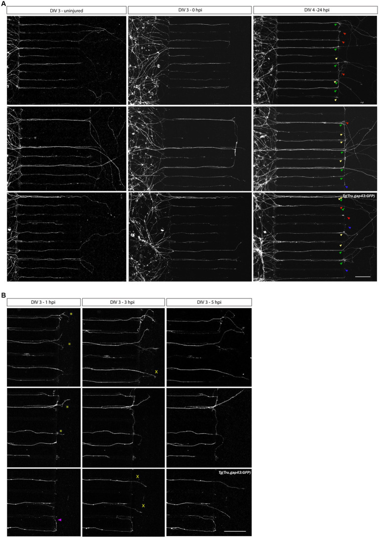 Axotomy and regeneration of adult zebrafish RGCs at DIV 3–4. Representative confocal live cell microscopy images taken before, upon and after injury in the same section of the AC, disclose that adult zebrafish RGCs regenerate spontaneously upon