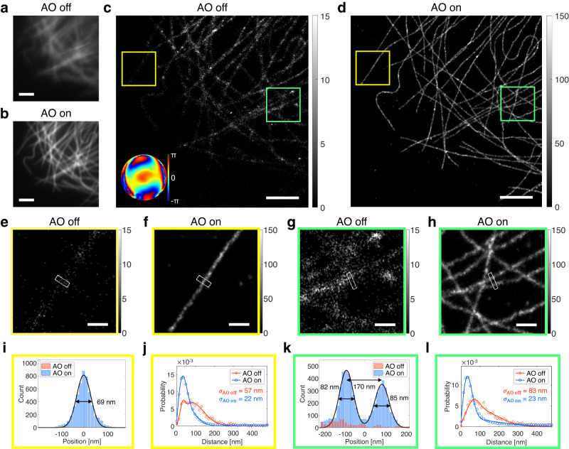 a, b Diffraction-limited fluorescence images without (a) and with (b) AO, respectively. Images are normalized with respect to AO on. Scale bars indicate 2.5 μm. c, d SMLM images without (c) and with (d) AO, respectively. Inset in (c) indicates the aberration correction map. Color bars indicate localization numbers. Scale bars indicate 2.5 μm.