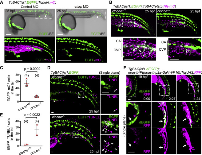Figure 3. The Npas4l (Cloche)-Etsrp axis is required for the differentiation of isl1+ endothelial progenitors into ECs (A) TgBAC(isl1:EGFP);Tg(kdrl:mCherry) embryos (25 hpf) injected with control morpholino oligonucleotide (MO) or etsrp MO. The boxed areas are enlarged (bottom). Arrowheads point to ventral isl1:EGFP+ cells in the tail. (B) TgBAC(isl1:EGFP);TgBAC(etsrp:Nls-mCherry) cloche+/? and cloche−/− sibling embryos (25 hpf). The boxed areas are enlarged (bottom). isl1:EGFP+ cells (arrows) rarely express etsrp:mCherry in cloche mutants. (C) Quantitative analysis of the data shown in (B). Number of isl1:EGFP/etsrp:mCherry double-positive cells in the tail of cloche+/? and cloche−/− sibling embryos. Data are mean ± SD. (D) TgBAC(isl1:EGFP) cloche+/? and cloche−/− sibling embryos (25 hpf) subjected to TUNEL staining. The boxed areas are enlarged on the right. Arrows point to isl1:EGFP/TUNEL double-positive cells. (E) Quantitative analysis of the data shown in (D). Number of isl1:EGFP/TUNEL double-positive cells in the tail of cloche+/? and cloche−/− sibling embryos. Data are mean ± SD. (F) Time-sequential images of a TgBAC(isl1:dEGFP);npas4lPt(npas4l-p2a-Gal4-VP16);Tg(UAS:RFP) embryo (from 19 hpf). Top, projection view; middle and bottom, single confocal planes of the boxed areas. isl1:dEGFP+ cells start to express npas4l:RFP and lose isl1:dEGFP expression (arrows). Scale bars: 200 μm in (A), 50 μm in (B) and (F), and 20 μm in (D). See also Figure S3.