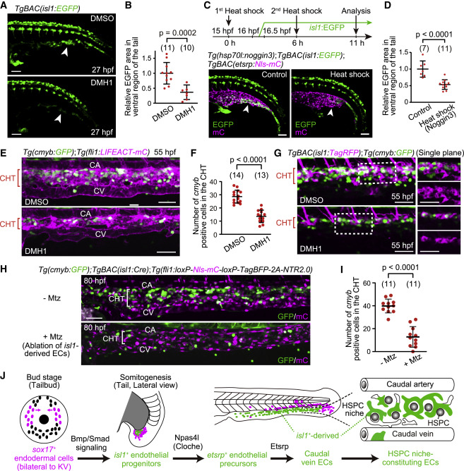 Figure 6. isl1+ endothelial progenitors are specified by Bmp-Smad signaling and constitute the vascular HSPC niche (A) TgBAC(isl1:EGFP) embryos treated with DMSO or DMH1 at 15 hpf (i.e., in advance of isl1:EGFP expression [16–16.5 hpf]) and observed 12 h after the treatment. The number of isl1:EGFP+ cells in the tail is markedly decreased by DMH1 treatment (arrowheads). (B) Quantitative analysis of the data shown in (A). isl1:EGFP area in the ventral region of the tail in embryos treated with DMH1 relative to that in embryos treated with DMSO. EGFP area is measured as in Figure S5B. Data are mean ± SD. (C) Tg(hsp70l:noggin3);TgBAC(isl1:EGFP);TgBAC(etsrp:Nls-mCherry) embryos without (control) or subjected to heat shock twice (upper, schematic illustration). The number of isl1:EGFP+ cells in the tail is markedly decreased by Noggin3 overexpression (arrowheads). (D) Quantitative analysis of the data shown in (C). isl1:EGFP area as in (B) in the heat-shocked embryos relative to that in embryos without heat shock. Data are mean ± SD. (E) Tail of Tg(cmyb:GFP);Tg(fli1:LIFEACT-mCherry) embryos (55 hpf) treated with DMSO or DMH1 for 12 h starting at 15 hpf. (F) Number of cmyb:GFP+ cells in the CHT regions of DMSO- or DMH1-treated embryos (54–55 hpf), as observed in (E). Data are mean ± SD. (G) Tail of TgBAC(isl1:TagRFP);Tg(cmyb:GFP) embryos (55 hpf) treated with DMSO or DMH1 for 12 h starting at 15 hpf as in (E). Left, projection view; right, single planes of the boxed areas. (H) Tail of TgBAC(isl1:Cre);Tg(fli1:loxP-Nls-mCherry-loxP-TagBFP-2A-NTR2.0) larvae (80 hpf) treated with or without Mtz for 24 h starting at 35 hpf. (I) Number of cmyb:GFP+ cells in the CHT regions of larvae (80–81 hpf) treated with or without Mtz, as observed in (H). Data are mean ± SD. (J) Schematic representation of the development of caudal vein ECs from sox17+ endodermal cells. Scale bars, 50 μm. See also Figure S5.