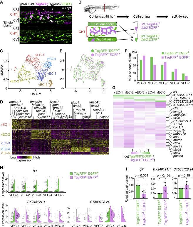 Figure 7. Transcriptomic heterogeneity and specialization in isl1-derived venous ECs constituting the vascular HSPC niche (A) Single confocal plane of the tail of a TgBAC(isl1:TagRFP);Tg(dab2:EGFP) embryo (48 hpf). Isl1:TagRFP+/dab2:EGFP+ cells are mostly present in venous ECs of the CHT (arrows). Isl1:TagRFP expression is also detected in the vISVs (yellow arrowheads) and motor neurons (white arrowhead). (B) Experimental design for scRNA-seq from the tail of TgBAC(isl1:TagRFP);Tg(dab2:EGFP) embryos. (C) Uniform manifold approximation and projection (UMAP) visualization of tail venous ECs corresponding to the venous EC cluster in Figure S6. Reclustered cells are color-coded for the 5 identified sub-clusters. (D) Heatmap illustrating the expression of the top-ranking marker genes enriched in each sub-cluster. Representative gene names are shown on top. (E) Mapping of isl1:TagRFP−/dab2:EGFP+ cells (772 cells: green) and isl1:TagRFP+/dab2:EGFP+ cells (449 cells: pink) into the UMAP shown in (C). (F) Percentage contribution of isl1:TagRFP−/dab2:EGFP+ cells and isl1:TagRFP+/dab2:EGFP+ cells to each venous EC sub-cluster. (G) Heatmap illustrating the log-count expression, log2(gene expression in isl1:TagRFP− EGFP+/gene expression in isl1:TagRFP+ dab2:EGFP+), of the 36 differentially expressed genes between isl1:TagRFP−/dab2:EGFP+ cells and isl1:TagRFP+/dab2:EGFP+ cells (q value < 0.05 in at least one sub-cluster). (H) Violin plots of the representative result of three genes; lyz, BX248121.1, and CT583728.24 in (G). The expression of lyz is dominant in isl1:TagRFP−/dab2:EGFP+ over isl1:TagRFP+ dab2:EGFP+ cells, whereas that of BX248121.1 and CT583728.24 is dominant in isl1:TagRFP+ dab2:EGFP+ cells over isl1:TagRFP−/dab2:EGFP+ cells. (I) isl1:TagRFP−/dab2:EGFP+ cells and isl1:TagRFP+/dab2:EGFP+ cells were isolated from the tail of TgBAC(isl1:TagRFP);Tg(dab2:EGFP) embryos at 48 hpf by fluorescence-activated cell sorting (FACS). Relative expression of lyz mRNA, BX248121.1 mRNA, and CT583728.24 mRNA in FACS-sorted cells was analyzed by quantitative PCR. Data are normalized to the values in isl1:TagRFP−/dab2:EGFP+ cells (fold change = 2(−ΔΔCt)). Data are mean ± SD. Each dot represents an individual experiment (n = 3 independent experiments). Scale bars, 50 μm. See also Figure S6 and Tables S1 and S2.