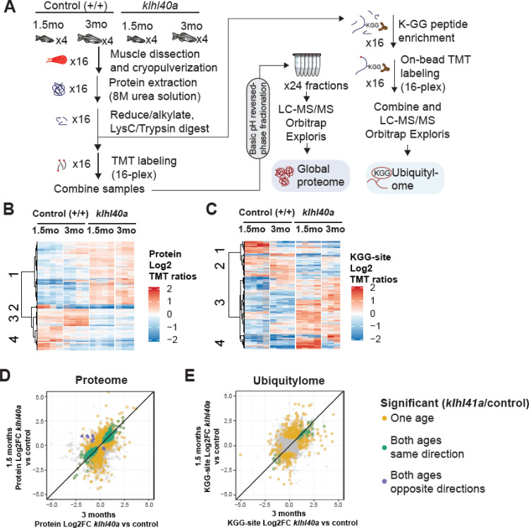 Figure 3 Proteome and ubiquitylome disruption by Klhl40a deficiency. (A) Experimental workflow for proteome and ubiquitylome quantification in klhl40a allele. (B) Heatmap showing protein abundances (log2 TMT ratios) across experimental samples. Only proteins with a significant differential response between control and klhl40a KO samples are shown (adjusted P-value <0.05). Proteins (rows) were clustered to show abundance patterns across experimental groups. (C) Heatmap showing ubiquitin sites following trypsin digestion (KGG)-site abundances (log2 TMT ratios) across experimental samples. Only proteins with a significant differential response between control and klhl40a KO samples are shown (adjusted P-value <0.05). KGG sites (rows) were clustered to show abundance patterns across experimental groups. (D) Correlation of protein response to klhl40a KO across juvenile (1.5 months) and adult animals (3 months). Plots show log2 fold changes for proteins quantified at both ages. Proteins are colored if they show differential abundance (adjusted p-value <0.05) at one age only (yellow), both ages with the same direction (green), and both ages with opposite directions (purple). (E) Correlation of ubiquitylome response to klhl40a KO across juvenile (1.5 months) and adult animals (3 months). Plots show log2 fold-changes for KGG-sites quantified at both ages. KGG sites are colored if they show differential abundance (adjusted p-value <0.05) at one age only (yellow), both ages with the same direction (green), and both ages with opposite directions (purple).