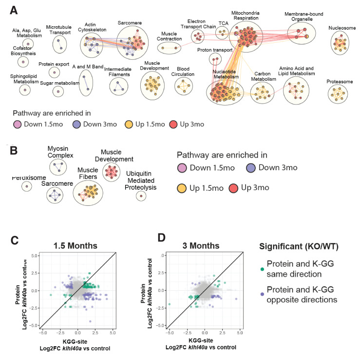 Figure 4 Pathways regulated by changes in proteome and ubiquitylome mediated by Klhl40a. (A) Network visualization of pathway enrichment results from klhl40a KO differential proteins compared to controls. Nodes (circles) indicate pathways significantly enriched in proteins that increase at 1.5 months, decrease at 1.5 months, increase at 3 months, or decrease at 3 months. Edges (connections) show nodes with overlapping genes. Clusters of nodes summarize pathways with similar biological functions. (B) Network visualization of pathway enrichment results from klhl40a KO differential KGG-sites compared to control. Nodes (circles) indicate pathways significantly enriched in KGG sites that increase at 1.5 months, decrease at 1.5 months, increase at 3 months, or decrease at 3 months. Edges (connections) indicate nodes with overlapping genes. Clusters of nodes summarize pathways with similar biological functions. (C) Fold-changes of KGG-sites and their cognate protein in response to klhl40a KO in 1.5 months animals compared to controls. Data points are colored if both the KGG-site and the cognate protein show differential abundance in KO vs. (+/+) control and have the same direction (green) or opposite directions (purple). (D) Fold-changes of KGG-sites and their cognate protein in response to klhl40a KO in 3 months animals compared to controls. Data points are colored if both the KGG-site and the cognate protein show differential abundance in KO vs. (+/+) control and have the same direction (green) or opposite directions (purple)