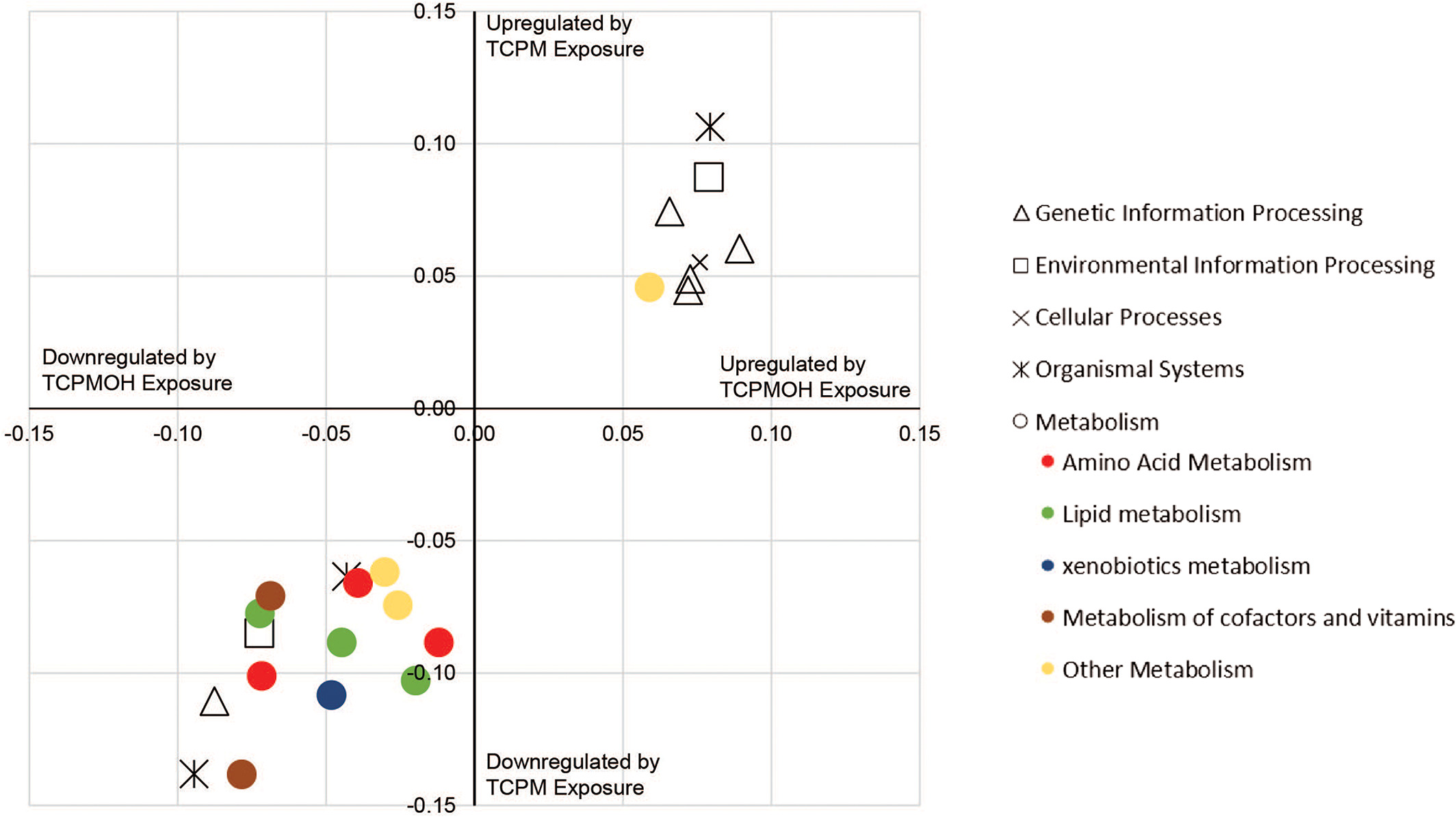 Fig. 5 KEGG pathways changed by tris(4-chlorophenyl)methane (TCPM) or tris(4-chlorophenyl)methanol (TCPMOH) exposure. Transcriptomic responses to TCPM and TCPMOH are correlated (R2 = .903). Pathways in the upper right quadrant are upregulated by exposure to TCPM and TCPMOH. Pathways in the lower left quadrant are downregulated by exposure to TCPM and TCPMOH.