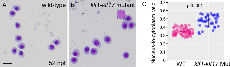 Wright–Giemsa staining of erythroid cells from wild-type and klf1-klf17 mutant embryos. (A, B) Wright–Giemsa staining at 52 hpf. Erythroid cells in the klf1-klf17 mutant (B) had larger nuclei and more basophilic cytoplasm than wild-type cells (A) at 52 hpf. Scale bar, 10 μm (A). Genotyping was performed by genomic PCR using locus-specific primers. (C) Scatter plots of the nucleus-to-cytoplasm (N:C) ratio in the wild-type (n = 6) and the klf1-klf17 mutant (n = 4) at 52 hpf. The N:C ratio in the klf1-klf17 mutant was larger than that in the wild-type. The central horizontal lines indicate the mean values. The data shown are the mean ± standard deviation (SD). Each wild-type and klf1-klf17 mutant sample contained 10 cells. P < 0.001 was considered significant.