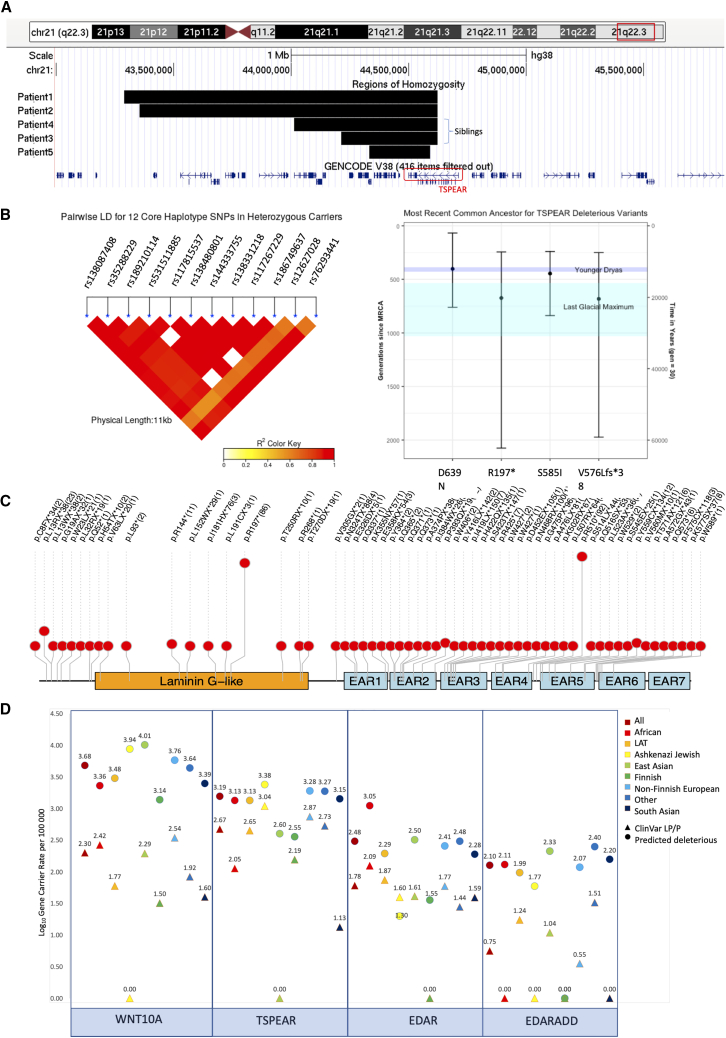 (C) Bar plot showing the estimated ages of founder variants seen in out TSPEAR cohort. Estimates shown were calculated using the gamma method (recombination clock) after estimating haplotypes using core SNVs for p.D639N and inconsistent homozygous genotypes for p.R197∗, p.S585I, and p.V576Lfs∗38. The mean for all variants falls within the last ice age, with both p.R197∗ and p.V576Lfs∗38 falling within the Last Glacial Maximum.