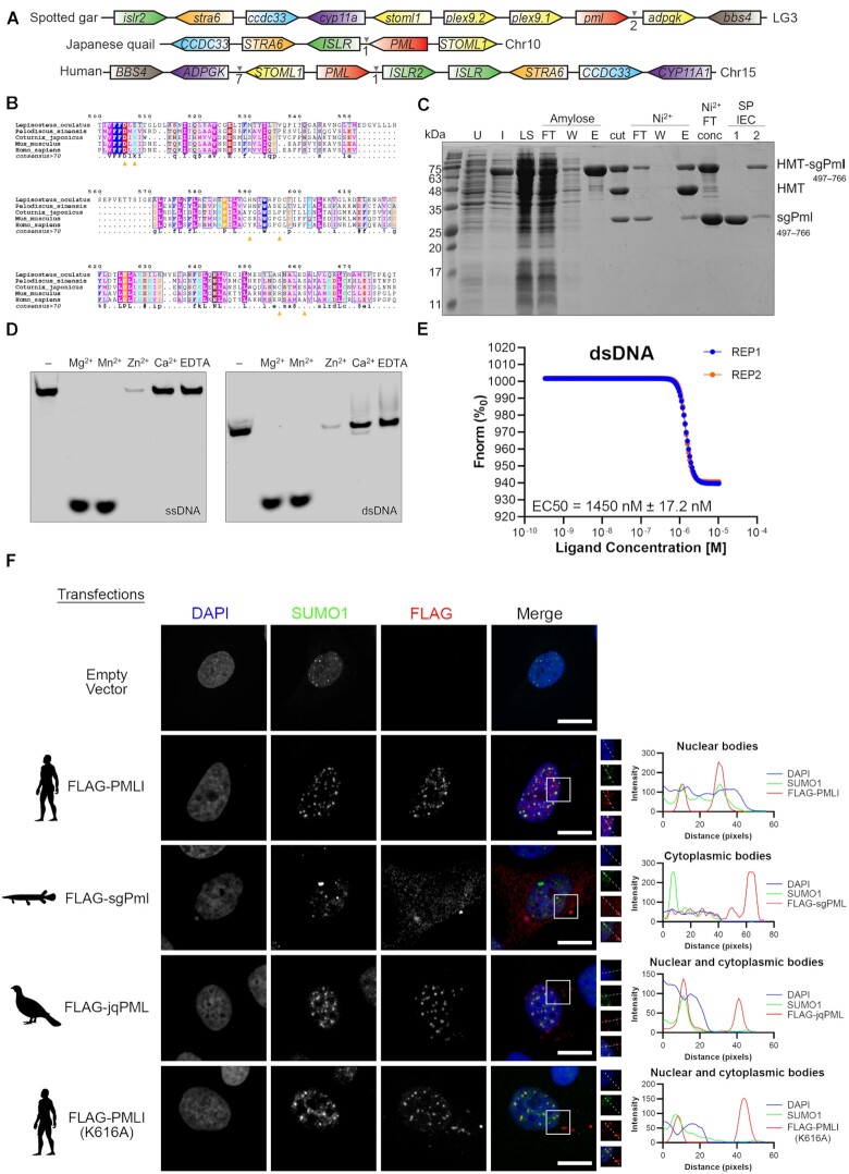 Spotted gar Pml is an active cytoplasmic DNA exonuclease. (A) Synteny of pml locus between the genomes of the Spotted gar, Japanese quail and Humans. Similarly coloured genes represent homologs between species. The intervening arrows with numbers indicate the number of adjacent genes between homologous genes. (B) MUSCLE alignment of the spotted gar PML (sgPml) C-terminal DEDDh exonuclease (CDE) domain protein with other PML orthologs. The consensus sequence is displayed below the sequences for residues with over 70% conservation across species. Yellow arrows indicate predicated catalytic residues for sgPml and the red circle indicates the conserved SUMOylation site (PML-I K616). (C) Purification of sgPml-CDE. sgPml-CDE was expressed as a fusion to sequences encoding for hexahistidine, maltose binding protein, and a TEV protease cleavage site (HMT). SDS-PAGE analysis is shown for samples of uninduced (U) and induced (I) cells, soluble lysate (LS), after TEV cleavage (cut), flowthrough (FT), wash (W), and elution (E) fractions of amylose and Ni2+ affinity chromatography, and fractions from ion exchange chromatography (IEC). (D) Exonuclease activity of sgPml-CDE requires Mg2+ or Mn2+. Fluorescent oligonucleotides were incubated with sgPml-CDE in the presence of the indicated divalent cation or EDTA. ‘-’ refers to input without the addition of cations. (E) sgPml binds to dsDNA with high affinity. Microscale thermophoresis was used to quantify the affinity between sgPml-CDE and dsDNA (n = 2). The different coloured lines are data shown for two replicates. (F) Subcellular localizations of FLAG-tagged PML-I, sgPml, quail (jqPML) and PML-I (K616A). Cells were transfected with either an empty vector or the indicated FLAG-tagged proteins. Colocalization between FLAG-tagged proteins and SUMO1 was assessed by immunostaining and shown at the right as line plot for the region of interest bound by the white box in the merged fluorescence image. Additional fields of view are shown in Supplementary Figure S16. Scale bars represent 10 μm.