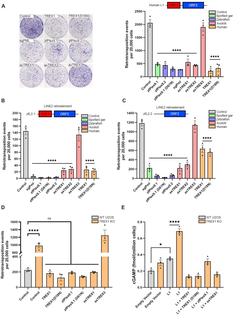 sgPml, Plex9 and axTREX1 proteins suppress LINE-1 (L1) activity in an exonuclease-independent manner. (A) Retrotransposition of human L1 was assessed with the co-expression of the FLAG-tagged versions of the indicated proteins. Resultant plates from the assay (right) were stained with 0.5% crystal violet and quantified. Retrotransposition activity of zebrafish L1 elements were also assessed in (B, left) zfL2-1 and (C, right) zfL2-2 (n = 3 for human L1, zfL2-1 and zfL2-2). (D) A TREX1 knockout was generated using CRISPR/Cas9 and validated in U2OS (details in Supplementary Figure S12). (D) Retrotransposition activity was elevated in TREX1 knockouts and addback of the zfPlex9.1 and zfPlex9.2, as well as axTREX1 and axTREX2 (n = 3). (E) 2′,3′-cGAMP levels in U2OS WT and TREX1 knockout cells after the transfection of an empty vector and the human L1 vector (n = 3). 2′,3′-cGAMP concentrations were normalized to cell number for each experiment. All proteins were expressed with a FLAG epitope with the exception of GFP-TREX1(D18N). Controls represent empty vector (FLAG-tag backbone) used in the co-transfection with the L1 plasmid. All experiments were analysed by a repeated measures one-way ANOVA and then a Tukey's multiple comparisons test between groups. Asterisks indicate the following: ****P< 0.0001, ***P < 0.001, **P < 0.01, *P < 0.05.