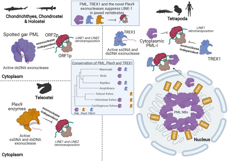 Overview of the suppression of LINE-1 retrotransposition in jawed vertebrates through the collective functions of PML, Plex9 and TREX1 enzymes. In fish, PML and novel Plex9 enzymes play a major role in suppressing both LINE-1 and LINE-2 elements. Despite the loss of PML in Teleost fish genomes, they have retained Plex9 genes for the purpose of restricting LINE retrotransposition. TREX1 appears later in tetrapods, where Plex9 genes are lost. In addition, enzymatic PML function is lost and the protein forms nuclear bodies rather than localizing to the cytoplasm. However, PML has a retained an exonuclease-independent role for the surveillance of LINEs by shuttling to the cytoplasm to suppress the LINE1 retrotransposition. Thus, the three protein families (PML, Plex9 and TREX) share an important function in maintaining genome integrity in jawed vertebrates by repressing LINE-1 propagation.