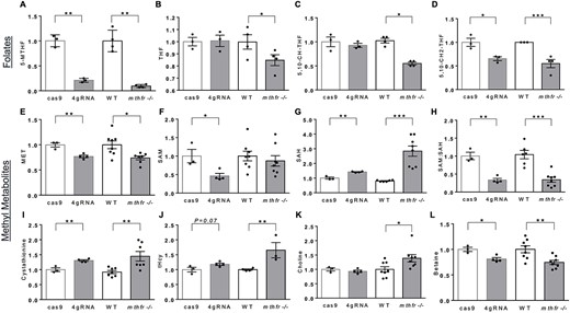 Fig. 6 mthfr deficiency in zebrafish reduces folates and alters 1-carbon cycle methyl metabolites. Relative concentrations of whole-body (A–D) folates and (E–L) related 1-carbon metabolites in zebrafish larvae at 5 dpf. Comparisons were conducted between cas9 versus 4gRNA mthfr crispants (4gRNA) or age-matched WT controls versus mthfr −/− mutants (mthfr −/−, HSC194). Values are mean ± SEM, n = 3–4 biological replicates of pooled zebrafish/group. Each pool was composed of n = 40 larvae for folates and n = 20 larvae for methyl metabolites for cas9 versus 4gRNA mthfr crispants and n = 50 larvae for folates and n = 30 larvae for methyl metabolites for WT versus mthfr −/− mutants. No differences in pooled weight were observed. Analyzed by Student’s t-test stratified by mutagenesis approach. Significant at *P < 0.05, **P < 0.01, ***P < 0.0001. Abbreviations: tHcy, total homocysteine; 5,10-CH-THF, 5,10-methenyltetrahydrofolate; 5,10-CH2-THF, 5,10-methylenetetrahydrofolate.