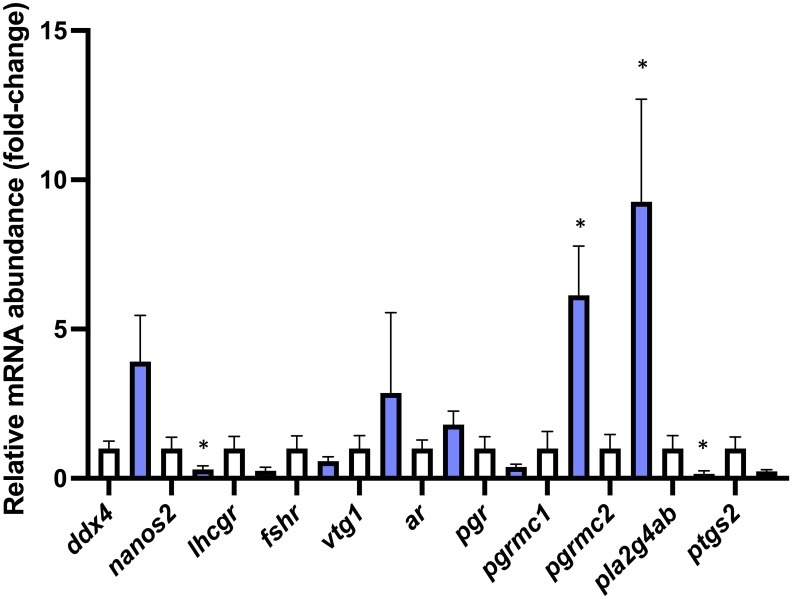 Targeted gene expression analysis of selected transcripts with characterized roles in different stages of oocyte development in WT (n=7) and