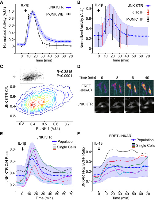 (D) 3T3 JNK KTR cells and 3T3-expressing FRET JNKAR were stimulated with IL-1β (1 ng/ml) and imaged at indicated time points. FRET image was calculated as described in the Experimental Procedures. Representative cells are shown for each technique over time.