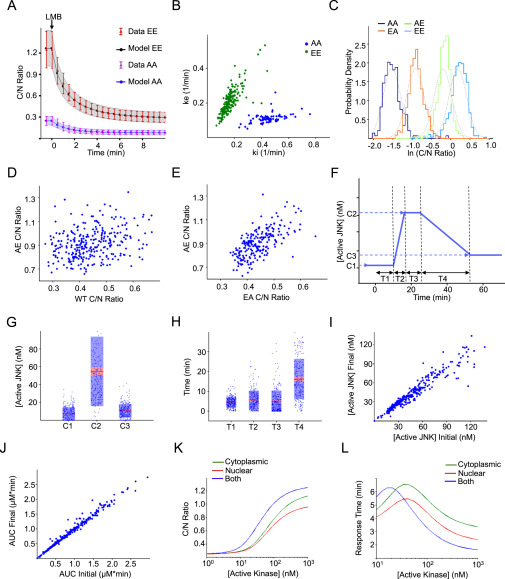 (I and J) C/N ratios were obtained from the temporal profiles calculated for Figure 4E (Initial). To test the robustness of our fitting procedure, noised ratio dynamics were then used to recalculate kinase activity temporal profiles (Final). Correlations between initial and final maximum active JNK concentration (I) and area under the curve (AUC) (J) are shown.
