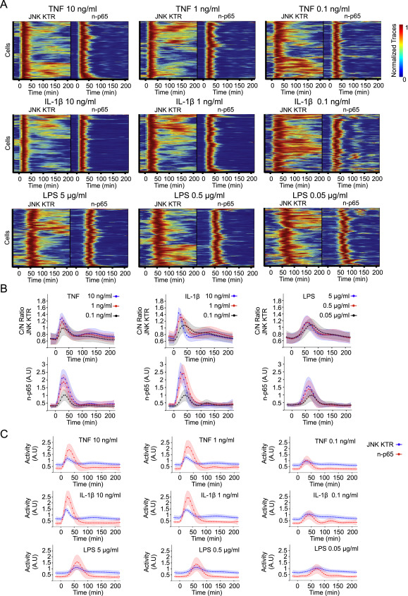 (A) Clonal line 3B8 (RelA−/− KO 3T3, H2B-EGFP, p65-DsRed and JNK KTR-mCerulean3) was stimulated with indicated concentrations of TNFα, IL-1β or LPS, imaged and quantified as described in Methods. Heat maps represent clustered individual cells with normalized JNK KTR and nuclear p65 (n-p65) dynamics displayed in tandem. Each condition represents a minimum of 300 cells obtained from 3 independent experiments.