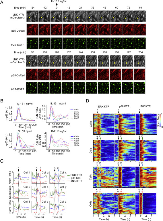(B) Clonal Line 3B8 was stimulated with IL-1β (1 ng/ml) or TNF (10 ng/ml), imaged and quantified as described in Methods. 5 single cells are shown in the p65 channel and in the JNK KTR channel. Note Cell 5, a and e as oscillating cells.