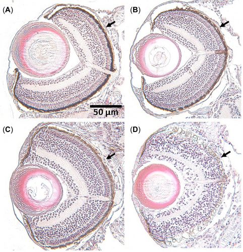 Fig. 2 Semiquantitative severity grading of the loss of pigmentation in the retinal pigment epithelium (indicated by arrows): To account for the different intensity levels of pigmentation loss, four grades were assigned: (A) no effect (control), (B) weak effect (low propylthiouracil [PTU] concentration), (C) clear effect (medium PTU concentration), (D) strong effect (high PTU concentration), after 5 days of exposure.
