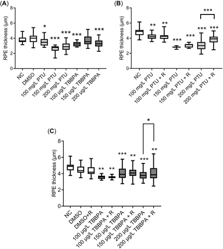 Fig. 5 Retinal pigment epithelium thickness of zebrafish larvae at 5 days postfertilization (dpf; A) and 8 dpf after exposure with or without recovery phase to propylthiouracil (B) and tetrabromobisphenol A (C). Data given as means ± SEM for n = 4 replicates (10–15 individuals). Statistically significant differences from the negative control or between continued exposure and recovery groups: *p < 0.05, **p < 0.01, ***p < 0.001. RPE = retinal pigment epithelium; NC = negative control (water); DMSO = dimethyl sulfoxide (solvent control, 0.002%); PTU = propylthiouracil; TBBPA = tetrabromobisphenol A; R = recovery (5-day exposure with the respective concentration and a 3-day recovery in clean water).