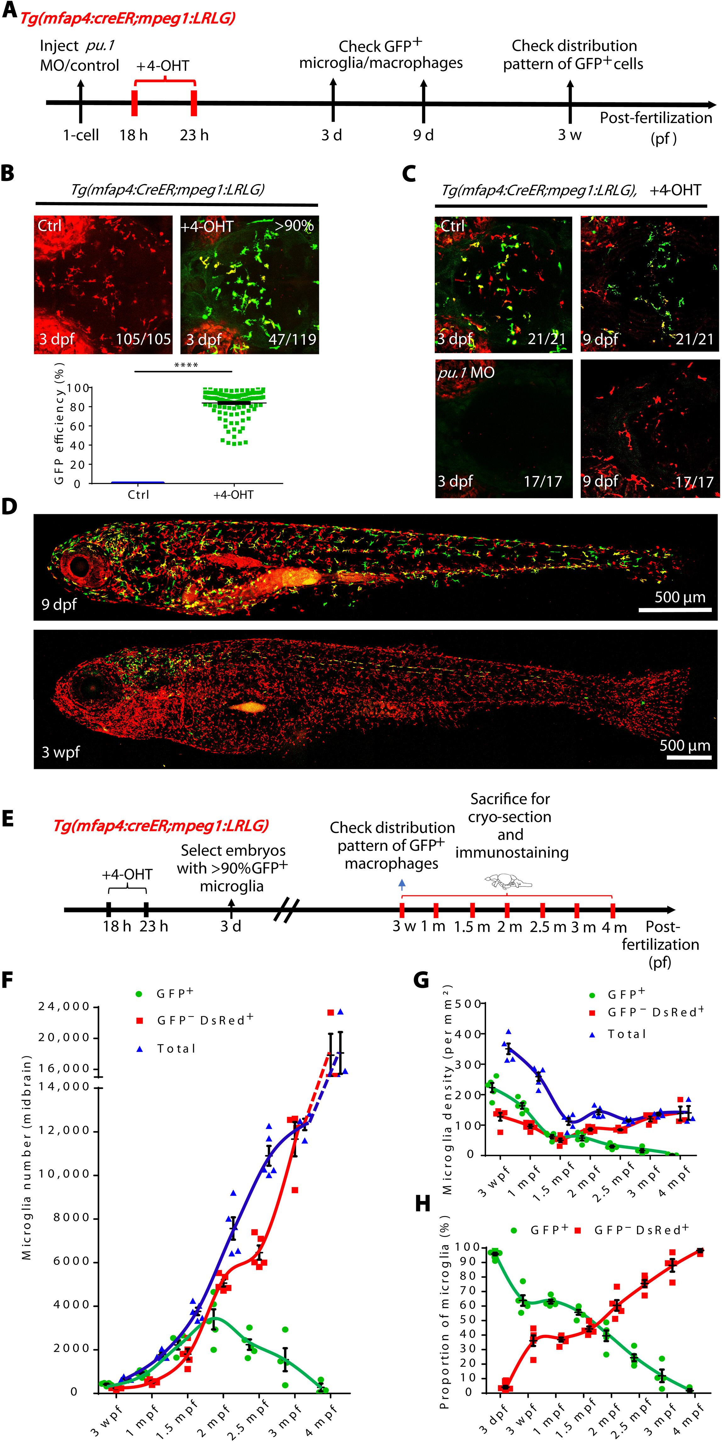 Fig. 1 The developmental dynamics of RBI and AGM microglia. (A) A timeline indicates 4-OHT treatment and fluorescent imaging of Tg(mfap4:CreER;mpeg1:LRLG) embryos. (B) Fluorescence imaging of microglia in the brain of 3 dpf Tg(mfap4:CreER;mpeg1:LRLG) embryos treated with 4-OHT from 18 to 23 hpf (top) and quantification of the label efficiency by percentage (GFP+ cells in total microglia in 3-dpf brain) (bottom) (Ctrl n = 105, +4-OHT n = 119). (C) Fluorescence imaging of microglia in the brain of 3 and 9 dpf control or pu.1 MO injected Tg(mfap4:CreER;mpeg1:LRLG) embryos treated with 4-OHT from 18 to 23 hpf. (D) Fluorescence imaging of 4-OHT–treated Tg(mfap4:CreER;mpeg1:LRLG) larva at 9 dpf and 3 wpf. Zebrafish larvae were in lateral view with anterior to the left to visualize the distribution of GFP+ cells throughout the body. (E) Schematic diagram shows the experimental setup for the treatment of embryos with 4-OHT and collection of samples for cryo-section. (F) Quantification of the absolute number of RBI and AGM microglia in the developing and adult midbrain. (G) Quantification of the density of RBI and AGM microglia in the developing and adult midbrain. (H) Quantification of the proportion of RBI and AGM microglia in the developing and adult midbrain. (F) to (H) Data were presented as mean ± SEM (3 dpf n = 12, 3 wpf n = 5, 1 mpf n = 5, 1.5 mpf n = 5, 2 mpf n = 5, 2.5 mpf n = 5, 3 mpf n = 4, and 4 mpf n = 3).