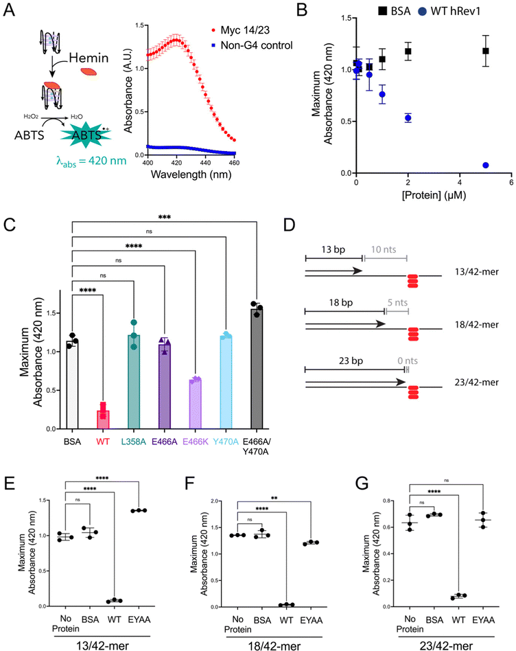 Fig. 3 Mutations in insert-2 alter the ability of hRev1 to disrupt G4 DNA. (A) A cartoon schematic is shown depicting the DNAzyme-based assay monitoring G4 integrity. Briefly, binding of hemin to an intact G4 structure catalyzes oxidation of ABTS to a peroxidation product with an absorption maximum near 420 nm. Incubating the reaction mixture with a G4-forming 29-mer Myc 14/23 ss-DNA (1 μM) oligonucleotide produces a strong absorbance peak near 420 nm (red circles). Incubating the reaction mixture with a non-G4 ss-DNA (1 μM) oligonucleotide did not produce a detectable change in absorbance near 420 nm (blue squares). (B) The maximum absorbance at 420 nm was plotted as a function of protein concentration for reactions where G4-forming 29-mer Myc 14/23 ss-DNA (1 μM) oligonucleotide was incubated with either BSA (black squares) or WT hRev1330-833 (blue circles). (C) The maximum absorbance at 420 nm was measured for reactions where G4-forming 29-mer Myc 14/23 ss-DNA (1 μM) oligonucleotide was incubated with 5 μM of the indicated proteins. (D) Cartoon schematics are shown to depict the different primer-template DNA substrates used for G4 hemin assay results shown in panel (E–G). Please note that the 3′-OH is positioned 10, 5, or 0 nts away from the first tetrad-associated guanine for the 13-mer, 18-mer, and 23-mer primers, respectively. (E) The maximum absorbance at 420 nm was measured for reactions where 13/42-mer DNA with the Myc 14/23 G4 motif in the template strand (1 μM) was incubated with 5 μM of the indicated proteins. (F) The maximum absorbance at 420 nm was measured for reactions where 18/42-mer DNA with the Myc 14/23 G4 motif in the template strand (1 μM) was incubated with 5 μM of the indicated proteins. (G) The maximum absorbance at 420 nm was measured for reactions where 23/42-mer DNA with the Myc 14/23 G4 motif in the template strand (1 μM) was incubated with 5 μM of the indicated proteins. Results shown in all panels represent the mean (± std. dev.) for three replicates. p-Values in panels (C and E–G) were calculated using an ordinary one-way ANOVA with a Dunnett's multiple comparisons test where ** = p-value < 0.01, *** = p-value < 0.001, **** = p-value < 0.0001, and ns = not significant.