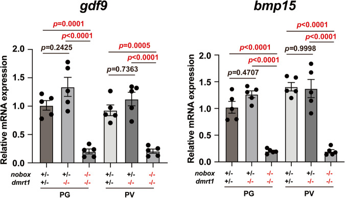 Total RNA was extracted from the isolated PG and PV follicles and reverse transcribed into cDNA for real-time PCR analysis. Each data point represents PG or PV follicles isolated and pooled from two fish for each genotype, totaling 10 fish (
