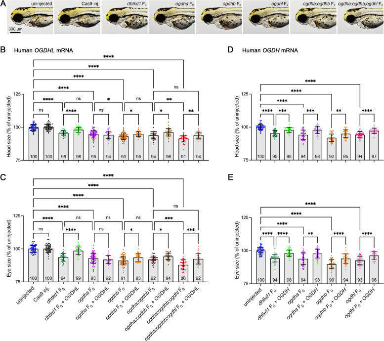 Comparing mRNA rescue levels of OGDHL and OGDH in Dhtkd1 and Ogdh paralog-deficient zebrafish. A Representative image of uninjected, Cas9-injected, single knockout (dhtkd1, ogdha, and ogdhb F0), double knockout (ogdha;ogdhb F0), and triple knockout (ogdha;ogdhb;ogdhl F0) embryos at 3 dpf. B, C Size measurements for head and eye with or without human OGDHL co-injection. The number of embryos for uninjected = 66, Cas9-injected = 60, dhtkd1 F0 = 36, dhtkd1 F0 + OGDHL = 36, ogdha F0 = 66, ogdha F0 + OGDHL = 36, ogdhb F0 = 66, ogdhb F0 + OGDHL = 36, ogdha;ogdhb F0 = 36, ogdha;ogdhb F0 + OGDHL = 36, ogdha;ogdhb;ogdhl F0 = 36 and ogdha;ogdhb;ogdhl F0 + OGDHL = 36. D, E The size measurements for head and eye with or without human OGDH co-injection. The number of embryos for uninjected = 60, dhtkd1 F0 = 36, dhtkd1 F0 + OGDH = 36, ogdha F0 = 36, ogdha F0 + OGDH = 36, ogdhb F0 = 36, ogdhb F0 + OGDH = 36, ogdhl F0 = 36, and ogdhl F0 + OGDH = 36. All values were calculated as a percentage difference compared to the mean value of the uninjected embryos. Each dot represents one embryo, and the mean value of each group is indicated at the bottom of the respective bar in the figure. Error bars = mean ± SD. Statistical significance was calculated by Brown–Forsthye and Welch’s ANOVA with Dunnett’s T3 multiple comparisons test: not significant (ns) p ≥ 0.05, *p < 0.05, **p < 0.01, ***p < 0.001, and ****p < 0.0001