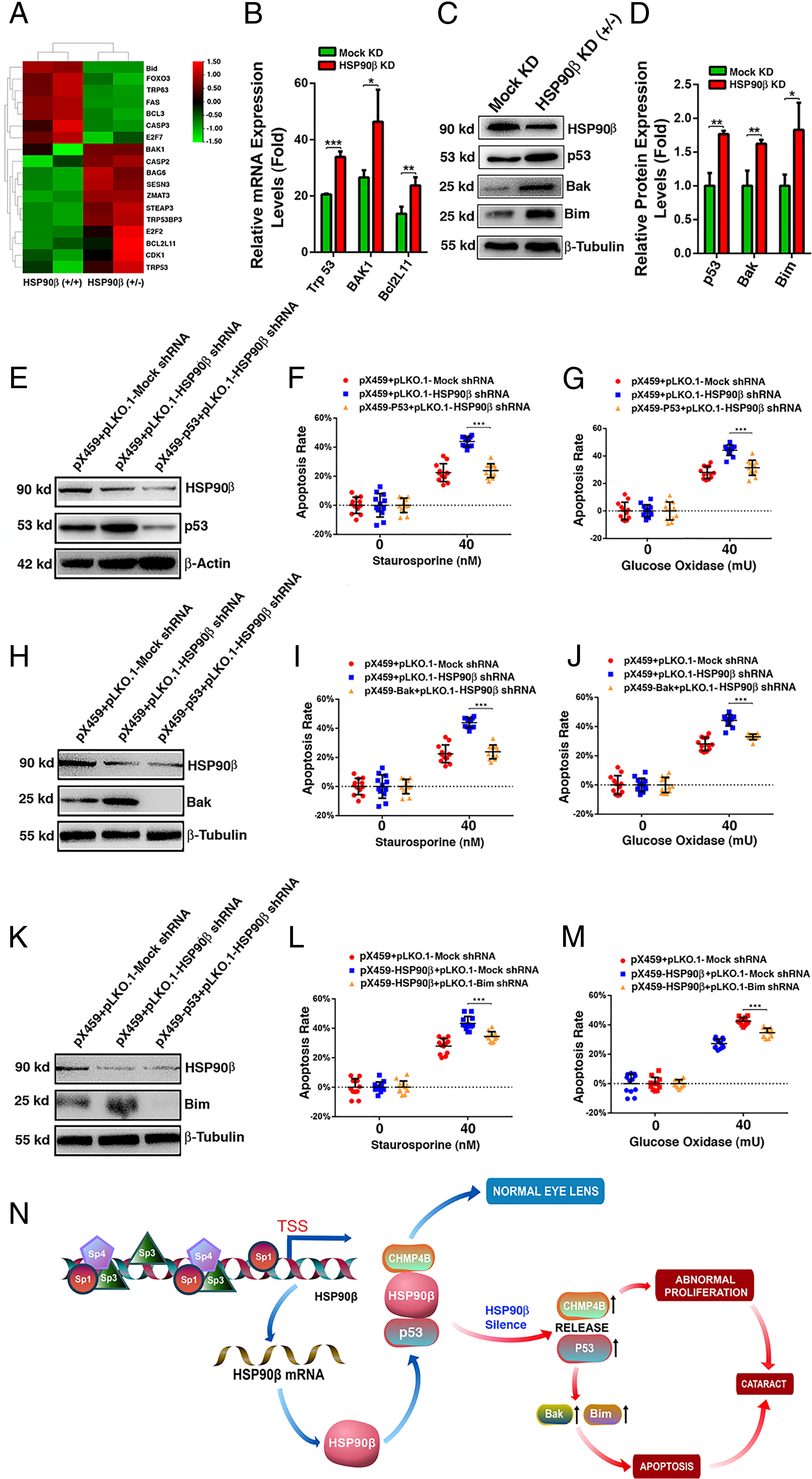 Fig. 4 HSP90β prevents stress-induced apoptosis through suppression of the p53-Bak/Bim pathway activation. (A) Hierarchical cluster analysis of apoptosis-associated genes from RNAseq analysis of pX459-HSP90β-αTN4-1 (HSP90β+/−) and pX459-αTN4-1 (HSP90β+/+) cells. (B) qRT-PCR analysis verified the mRNA expression levels of p53, Bak, and Bim in HSP90β (+/+) αTN4-1 cells and HSP90β (+/−) αTN4-1 cells. (C) Western blot analysis of the expression levels of p53, Bak and Bim in HSP90β (+/+) αTN4-1 cells and HSP90β (+/−) αTN4-1 cells. Note that the expression levels of p53, Bak, and Bim were up-regulated with the downregulation of HSP90β. (D) Quantitative results of (C). (E) Western blot analysis of HSP90β and p53 in pX459+pLKO.1 vectors-αTN4-1 cells [HSP90β (+/+)/p53 (+/+)], pX459+pLKO.1-HSP90β shRNA-αTN4-1 cells [HSP90β (+/−)/p53 (+/+)] and pX459-p53+pLKO.1-HSP90β shRNA-αTN4-1 cells [HSP90β (+/−)/p53 (+/−)]. (F and G) Differential apoptosis rates in the above three types of cells without or with treatment by 40 nM staurosporine or 40 mU/mL GO. The cell viability is measured by the Cell Titer-Lumi™ Luminescent Cell Viability Assay Kit. (H) Western blot analysis of HSP90β and Bak in pX459+pLKO.1 vectors-αTN4-1 cells [HSP90β (+/+)/Bak (+/+)], pX459+pLKO.1-HSP90β shRNA-αTN4-1 cells [HSP90β (+/−)/Bak (+/+)] and pX459-Bak+pLKO.1-HSP90β shRNA-αTN4-1 cells [HSP90β (+/−)/Bak (−/−)]. (I and J) Differential apoptosis rates in the above three types of cells without or with treatment by 40 nM staurosporine or 40 mU/mL GO. The cell viability is measured by the Cell Titer-LumiTM Luminescent Cell Viability Assay Kit. (K) Western blot analysis of HSP90β and Bim in pX459+pLKO.1 vectors-αTN4-1 cells [HSP90β (+/+)/Bim (+/+)], pX459+pLKO.1-HSP90β shRNA-αTN4-1 cells [HSP90β (+/−)/Bim (+/+)] and pX459-Bim+pLKO.1-HSP90β shRNA-αTN4-1 cells [HSP90β (+/−)/Bim (−/−)]. (L and M) Differential apoptosis rates in the above three types of cells without or with treatment by 40 nM staurosporine or 40 mU/mL GO. The cell viability is measured by the Cell Titer-Lumi™ Luminescent Cell Viability Assay Kit. Note that knockout of p53, Bak, or Bim attenuates staurosporine- or GO-induced apoptosis in HSP90β (+/−)-αTN4-1 cells, suggesting that HSP90β prevents stress-induced apoptosis through suppression of p53-Bak/Bim pathway activation. (N) Summary of HSP90β regulation and functions in the ocular lens. Under nonstress induction conditions, the dominant expression of HSP90β is mainly regulated by the Sp1 family transcription factors. The high level of HSP90β can interact with CHMP4B, a newly-found client protein, and p53 to maintain normal cell proliferation and survival to keep lens transparency. Silence of HSP90β induces upregulation of CHMP4B and p53. The increased expression of CHMP4B promotes cell proliferation, and accumulation of the excess number of lens epithelial cells without proper differentiation will cause cataractogenesis. On the other hand, p53 upregulation enhances expression of Bim and Bak, triggering apoptosis of lens epithelial cells, leading to cataractogenesis. Error bar represents SD. *P < 0.05; **P < 0.01; ***P < 0.001.