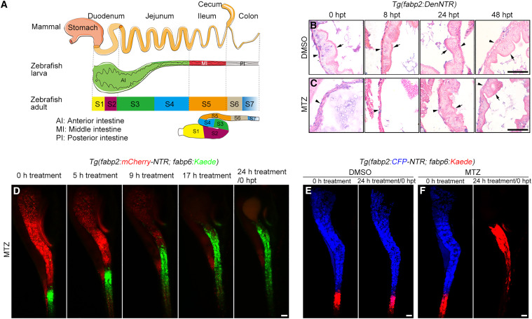 Fig. 1 Ileal enterocytes migrate to the extensively injured jejunum (A) The anterior, middle, and posterior intestine of zebrafish larvae correspond to mammalian duodenum plus jejunum, ileum, and colon, respectively. The S1-S2, S3-S4, S5, and S6-S7 intestinal segments of zebrafish adults are equivalent to mammalian duodenum, jejunum, ileum, and colon, respectively. (B and C) In contrast to the uninjured intestine (B), H&E staining showed that the intestinal villi collapsed at 0 hpt and 8 hpt after MTZ-induced injury, then rapidly recovered at 24 hpt and 48 hpt (C). The arrowheads indicate basement membrane, while the arrows indicate villus. (D) Live imaging showed that the Kaede-green+ ileal enterocytes quickly responded to the MTZ-induced jejunal injury and migrated into the jejunum. See Video S1. (E and F) Photoconversion of Kaede-green to Kaede-red showed that in contrast to the uninjured control (E), the Kaede-red+ ileal enterocytes migrated into jejunum in response to extensive jejunal enterocyte damage (F). “24 h treatment” is equivalent to 0 hpt. Scale bars, 50 μm. See also Figures S1 and S2.