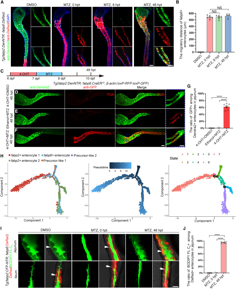 Fig. 4 Migrated ileal enterocytes transdifferentiate into jejunal enterocytes (A) Compared with the uninjured larvae under the Tg(fabp2:DenNTR; fabp6:dsRed) transgenic background, fabp6+ enterocytes migrated to jejunum at 0, 8, and 48 hpt. The migrated DsRed+ enterocytes in the injured jejunum expressed the fabp2:Dendra2 transgene at 48 hpt. The dash-framed areas are enlarged in the panels on their right. (B) Graph showing quantification of migratory distance (n = 6). Data are presented as mean ± SEM. Not significant (NS), two-tailed unpaired t test. (C–G) Stratagy of 4-OHT treatment (C). The Cre/loxP-mediated lineage tracing of ileal enterocytes. Uninjured larvae treated with 4-OHT served as the positive control, in which the ileal enterocytes were labeled with GFP (D). Negatively controlled by ethanol plus MTZ treatment (E), larvae treated with 4-OHT and MTZ exhibited GFP+Dendra2+ enterocytes in the injured jejunum (F). The dash-framed areas are enlarged in the right-hand panel. The statistics show that approximately 60% of the regenerated jejunal enterocytes were positive for GFP at 48 hpt (G, n = 7). Data are presented as mean ± SEM. ∗∗∗∗p < 0.0001, two-tailed unpaired t test. (H) A total of 8,234 cells were used for pseudotime trajectory of fabp2+ enterocyte, fabp6+ enterocyte, and precursor-like. The gradient from dark to light blue denotes the time increment. The seven states were identified by gene expression profiles in pseudotime. (I) BODIPY FL C5 green fluorescent droplets indicate lipid absorption. The enterocytes in the ileum are devoid of lipid uptake function (arrows). However, the ileal enterocytes migrated into the injured jejunum at 48 hpt and gained the function of lipid absorption (arrowheads). (J) Graph showing quantification of rate of BODIPY FL C5+ among DsRed+ enterocytes. Data are presented as mean ± SEM. ∗∗∗∗p < 0.0001, two-tailed unpaired t test. Scale bars, 50 μm. See also Figures S4 and S5.