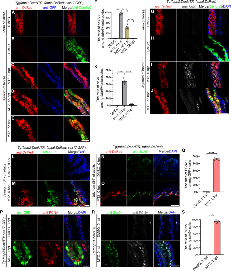 Fig. 6 Migrated ileal enterocytes in both larvae and adults express gut precursor markers (A–K) In the uninjured larvae, ileal enterocytes did not express sox17:GFP transgene and Sox9 (A and G). In the MTZ-injured larvae, the migrated DsRed+ ileal enterocytes in the jejunum expressed the sox17:GFP transgene (B and C) and Sox9 (H and I) at 0 hpt, followed by expression of Dendra2 at 48 hpt (D), finally downregulating sox17:GFP transgene (E) and Sox9 (J) at 72 hpt. (F) Graph showing quantification of ratio of Sox17+ among DsRed+ enterocytes (n = 6). (K) Graph showing quantification of ratio of Sox9+ among DsRed+ enterocytes (n = 6). Data are presented as mean ± SEM. ∗∗∗∗p < 0.0001, two-tailed unpaired t test. (L–O) Similarly, in MTZ-injured adults, the migrated DsRed+ ileal enterocytes in the S4 segment of jejunum expressed the sox17:GFP transgene (L and M) and Sox9 (N and O) at 0 hpt. (P–S) The sox17+ (P) and sox9+ (R) cells expressed PCNA. Graphs show ratio of PCNA+ cells among the sox17+ (Q) and sox9+ (S) cells. Data are presented as mean ± SEM. ∗∗∗∗p < 0.0001, two-tailed unpaired t test. Scale bars, 50 μm. See also Figure S7.