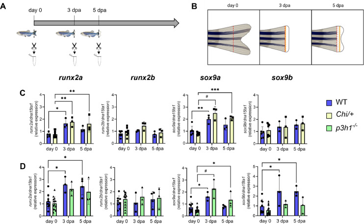 Fig. 3 Sample collection and gene expression analysis of the early differentiation markers runx2a, runx2b, sox9a and sox9b in WT and mutants. (A) RNA was collected from pools of six caudal fins at day 0, 3 and 5 dpa as shown in the scheme. (B) Detailed schematic view of collected caudal fin samples. Day 0 refers to the portion of the caudal fin obtained after the first amputation at basal state; 3 dpa and 5 dpa regenerates were collected above the amputation plane. Created with BioRender.com. (C) RT-qPCR analysis in WT and Chi/+ zebrafish. runx2a and sox9a showed a significant increase after amputation, with no difference among genotypes. (D) RT-qPCR analysis in WT and p3h1−/− revealed the same trend observed in the previous group. n ≥ 3 pools of caudal fins for each genotype. dpa: days post amputation. Each dot represents a single value: circle for WT, square for Chi/+ and triangle for p3h1−/−. * P < 0.05, ** P < 0.01, *** P < 0.001, # P < 0.0001.