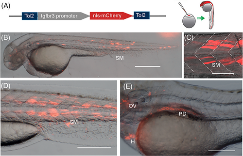 Fig. 3 tgfbr3 promoter drives reporter expression during embryonic development. (A) p3.2tgfbr3:nls-mCherry:polyA reporter plasmid was injected in single cell zebrafish embryos, resulting in the mCherry mosaic expression at later stages. (B, C) 48 hpf embryos display mCherry in the head and skeletal muscle cells (SM) in somites resembling the aspect of superficial slow muscle fibers. (D, E) 72 hpf zebrafish embryos with reporter expression in skeletal muscle (SM), otic vesicle (OV), pronephric duct (PD), and heart (H). All images were acquired in a stereoscopic microscope Nikon SM1500. Scale bars: 400 μm in (B); 50 μm in (C, D); and 200 μm in (E).