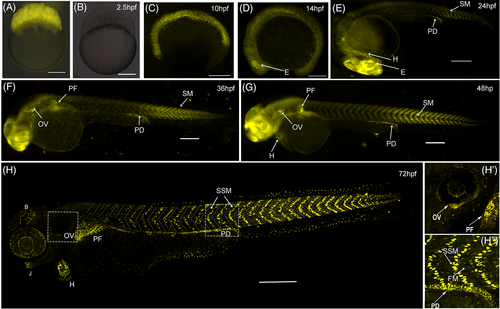 Fig. 4 mCherry expression begins just before somite formation. (A, B) mCherry fluorescence (shown in yellow) in 2 hpf zebrafish zygotes obtained from a wild-type fish crossed with a transgenic female (panel A) or transgenic male (panel B). (C-H) zygotic mCherry expression in zebrafish embryos obtained from crosses of transgenic males and wild-type females starts at 10 hpf (panel C). By the 14 hpf (panel D), mCherry is observed in the eye (E) and mesodermal tissue including the somites. At later stages (panels E-H), mCherry expression is clearly observed in the trunk superficial skeletal muscle (SSM), heart (H), pectoral fin (PF), otic vesicle (OV), pronephric duct (PD), jaw (J), and non-identified cells from the eye and brain (B). Inset H′ shows the reporter expression in the OV and PF. Inset H" shows mCherry in skeletal mononuclear muscle cells at the level of somites 14 to 16. Scale bars 200 μm.