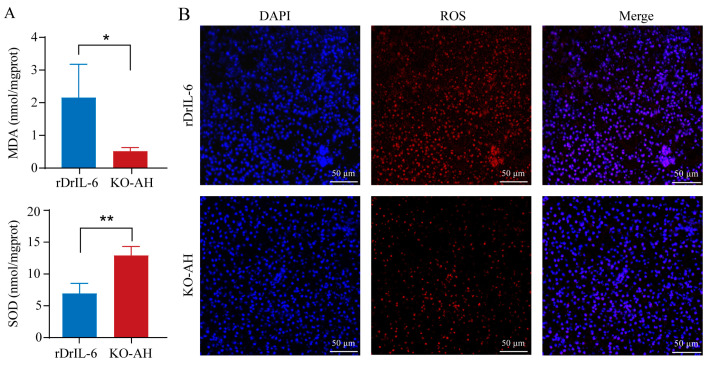 Effect of rDrIL-6 protein on liver oxidative stress in il-6−/− zebrafish post A. hydrophila infection. (A) MDA and SOD levels in liver tissues after A. hydrophila infection. Samples used for enzyme activity (biological replicates = 5, experimental repetitions = 3) were collected 12 h after infection. The experimental data were subjected to the Student’s t-test to identify the significance. Compared with the KO-AH group, the rDrIL-6 group showed significantly higher levels of MDA and lower SOD activities. * p < 0.05; ** p < 0.01. (B) Representative staining of ROS in liver sections. Frozen tissue sections were used for immunofluorescence detection of ROS. Red fluorescence corresponds to the presence of ROS, while blue fluorescence represents the cell nucleus. Scale bar = 50 μm. rDrIL-6: il-6−/− zebrafish treated with a mixture of A. hydrophila and rDrIL-6 protein; KO-AH: il-6−/− zebrafish treated with A. hydrophila.