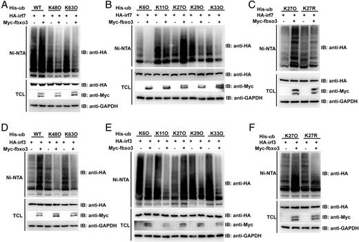 Fig. 9 Overexpression of fbxo3 inhibits K27-linked polyubiquitination of irf3 and irf7. (A) fbxo3 promoted the polyubiquitination of irf7 but not lysine 48 (K48)–linked polyubiquitination and lysine 63 (K63)–linked polyubiquitination. (B) fbxo3 promoted lysine 27 (K27)–linked polyubiquitination of irf7 but did not promote K6-, K11-, K29- and K33-linked polyubiquitination. (C) fbxo3 promoted K27-linked polyubiquitination of irf7. (D) fbxo3 promoted the polyubiquitination of irf3 but not K48-linked polyubiquitination and K63-linked polyubiquitination. (E) fbxo3 promoted the K27 polyubiquitination of irf3 but did not promote the K6-, K11-, K29-, and K33- inked polyubiquitination of irf3. (F) fbxo3 promoted K27-linked polyubiquitination of irf3. HEK 293T cells were transfected with HA-irf3 (6 μg) or HA-irf7 (6 μg), Myc-fbxo3 (4 μg), or empty vector (4 μg), together with His-ubiquitin or its mutants (4 μg). At 18 h posttransfection, the cells were treated with MG132 for 6 h. At 24 h posttransfection, the cells were lysed using guanidinium chloride, and purified with Ni2+-NTA agarose. IB, immunoblot; KO, K-only; KR, K is mutated to R.