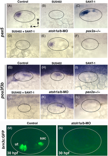 Fig. 1 Effects of disrupting Fgf, Hh or early sensory development. Dorsolateral views of pax5 (A-F) and pou3f3b (G-L) at 24 hpf under conditions listed at the top. (A-D, G-J) Drug treatments were administered at 12 hpf to inhibit Fgf (70 μM SU5402) or Hh (150 μM SANT-1). The same treatment conditions were used in subsequent figures unless otherwise noted. (E, K) atoh1a-MO and atoh1b-MO were co-injected at the one-cell stage. (F, L) expression in pax2a−/− mutants. (M, N) Live images showing brn3c:Gfp expression in hair cells at 30 hpf in a wild-type embryo (M) and an atoh1a-atoh1b double morphant (N). Oval marquees denote the outer edge of the otic vesicle in this and all subsequent figures.