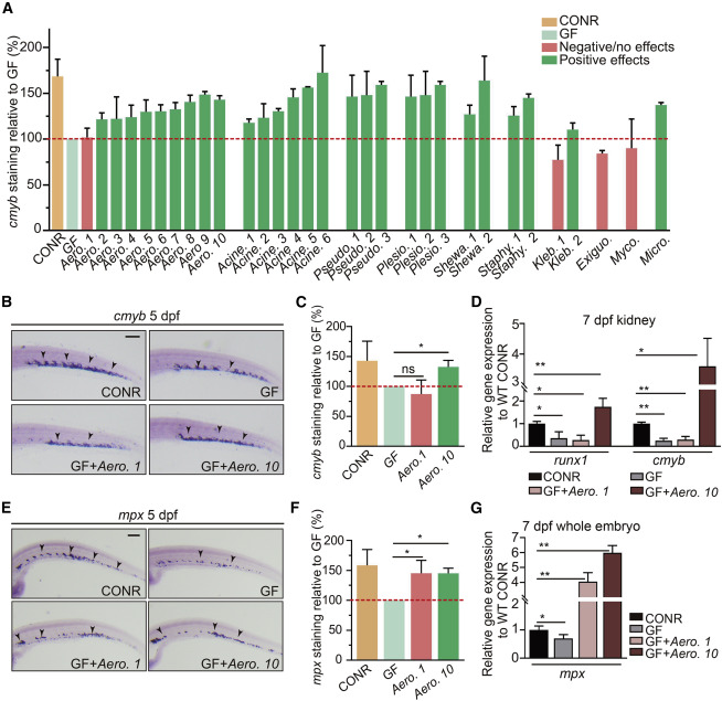 Fig. 4 Individual bacterial members of zebrafish microbiota exhibit differential effects on HSPC development (A) Quantification of cmyb staining in WT CONR, GF larvae, and GF larvae at 3 dpf mono-associated with a specific bacterial strain. Bacterial mono-associations are labeled by genus. Different bacterial species within the same genus are labeled with a number (1, 2, 3, and so on). (B) WISH for cmyb in WT CONR, GF larvae, and GF larvae treated with bacterial strains Aero. 1 or Aero. 10. (C) Quantification of WISH results from (B). (D) qPCR analysis of runx1 and cmyb expression in the kidney at 7 dpf of WT CONR, GF larvae, and GF larvae treated with Aero. 1 or Aero. 10. (E) WISH for mpx in WT CONR, GF larvae, and GF larvae treated with Aero. 1 or Aero. 10. (F) Quantification of WISH results from (E). (G) qPCR analysis of mpx expression at 7 dpf in whole embryos of WT CONR, GF larvae, and GF larvae treated with Aero. 1 or Aero. 10. ANOVA in all analyses; mean ± SEM of three independent experiments, n = 45–60 larvae per group for WISH, 30–40 larvae per group for qPCR analysis, ∗p < 0.05, ∗∗p < 0.01, ns, not significant. Scale bars, 200 μm. See also Figure S4.