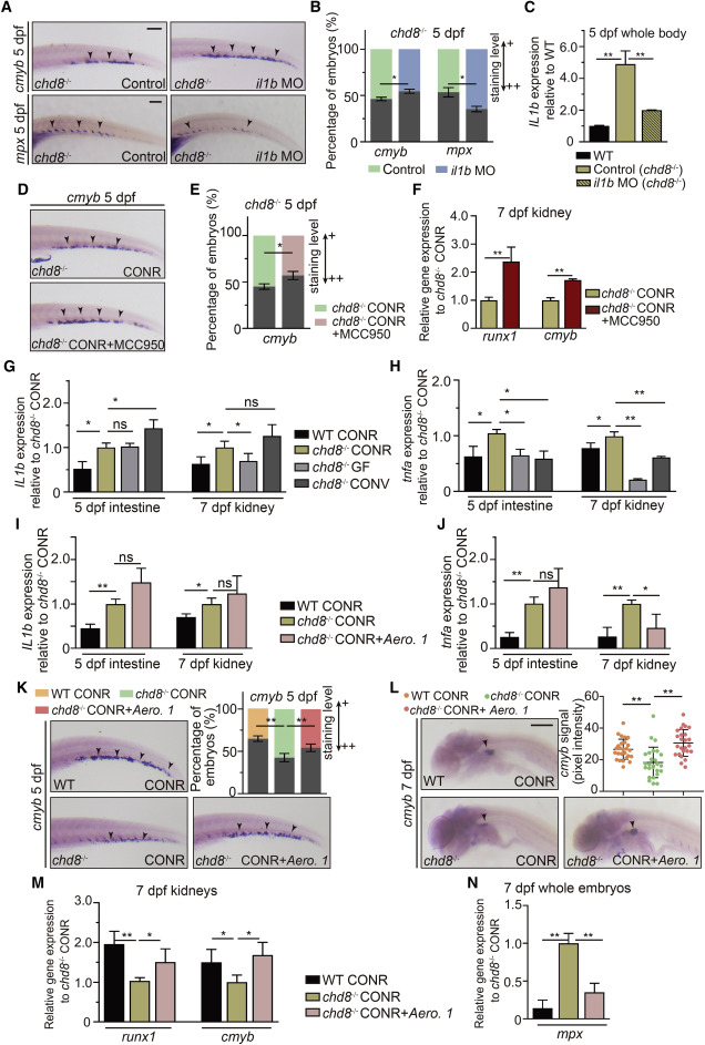 Fig. 7 Selective inhibition of elevated cytokine expression in chd8−/− kidney by microbiota intervention rebalances HSPC development and myeloid differentiation (A) WISH for cmyb and mpx in chd8−/− and chd8−/− larvae injected with il1b MO. (B) Quantification of WISH results from (A). (C) qPCR analysis of il1b expression at 5 dpf in the whole embryos of WT, chd8−/−, and chd8−/− larvae injected with il1b MO. (D) WISH for cmyb at 5 dpf in chd8−/− and chd8−/− larvae treated with MCC950 from 3 dpf. (E) Quantification of WISH results from (D). (F) qPCR analysis of runx1 and cmyb expression in kidney at 7 dpf of chd8−/− CONR and chd8−/− CONR larvae treated with MCC950 from 3 dpf. (G and H) qPCR analysis of il1b (G) and tnfa (H) in the intestine and kidney obtained from WT CONR, chd8−/− CONR, chd8−/− GF larvae, and chd8−/− GF larvae treated with microbiota from the CONR WT at 3dpf. (I and J) qPCR analysis of il1b (I) and tnfa (J) in the intestine and kidney obtained from WT CONR, chd8−/− CONR larvae, and chd8−/− CONR larvae treated with Aero. 1 at 3 dpf. (K) WISH for cmyb at 5 dpf in WT CONR, chd8−/− CONR, and chd8−/− CONR larvae treated with Aero. 1 at 3 dpf. (L) WISH for cmyb in the kidney at 7 dpf in WT CONR, chd8−/− CONR, and chd8−/− CONR larvae treated with Aero. 1 at 3 dpf, each data point represents an individual larva, n = 26–30 per group. (M) qPCR analysis of runx1 and cmyb expression in the kidney of WT CONR, chd8−/− CONR larvae, and chd8−/− CONR larvae treated with Aero. 1 at 3 dpf. (N) qPCR analysis of mpx expression in the whole embryos in WT CONR, chd8−/− CONR larvae, and chd8−/− CONR larvae treated with Aero. 1 at 3 dpf. Student’s t tests in (B, C, E, and F), ANOVA in (G–J and L–N); means ± SEM of three independent experiments, n = 45–60 larvae per group for WISH, n = 30–40 larvae per group for qPCR, ∗p < 0.05, ∗∗p < 0.01; ns, not significant. Scale bars, 200 μm. See also Figure S7.