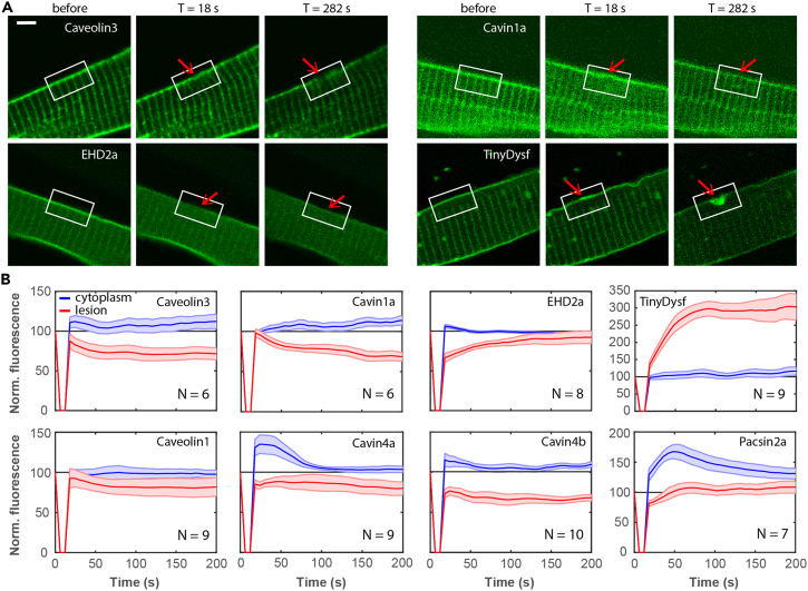 (A) Caveolar proteins do not accumulate in the lesion patch. Fluorescence images of individual cells expressing Caveolin3-Clover, Clover-Cavin1a, EHD2a-Clover, and TinyDysf-Clover before and after laser-induced damage. The lesioning sites are marked by red arrows; white boxes surrounding the lesion sites mark regions with pronounced intensity changes. Scale bar (applies to all panels), 5 μm.