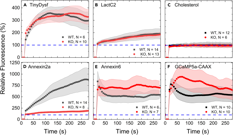 (F) GCaMP5a-CAAX. Symbols show averages over multiple cells (cell numbers,