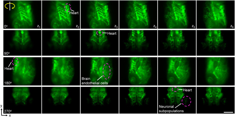 3D visualization of the fluorescently labeled blood vasculature and neurons. The label of