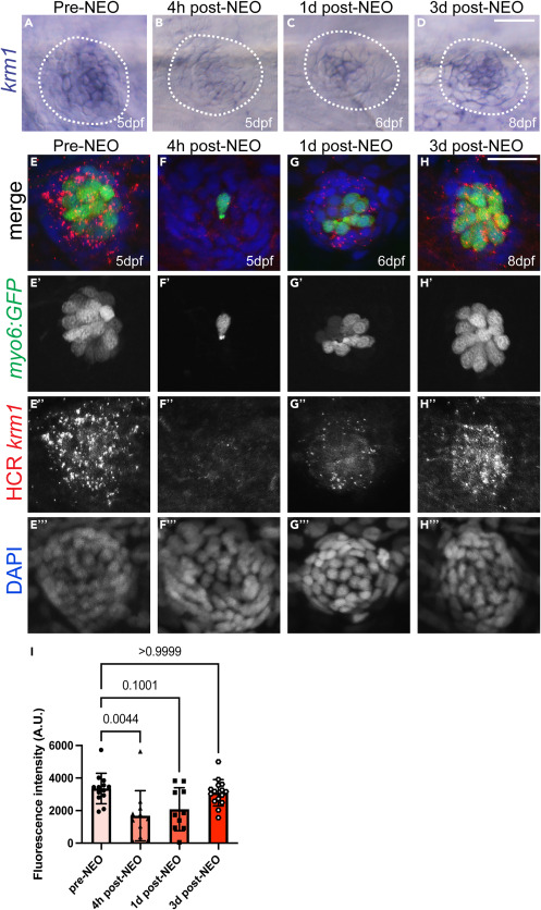 Fig. 1 krm1 expression is dynamic during posterior lateral line regeneration (A–D) RNA in situ hybridization of krm1 showing expression in 5dpf NM prior to exposure to NEO, 4 h after NEO exposure, 1 day post NEO exposure in a 6dpf larva, and 3 -days post NEO exposure in 8dpf larva. (E–H) Confocal projections of HCR-FISH showing krm1 expression (red) during regeneration in wild-type NMs in Tg(myosin6b:GFP)w186 larvae (green) with nuclei labeled with DAPI (blue) in 5dpf NM prior to exposure to NEO, 4 h after NEO exposure, 1 day post NEO exposure in a 6dpf larva, and 3 days post NEO exposure in a 8dpf larva. (I) Quantification of fluorescence intensity in arbitrary units (A.U.) of HCR krm1 expression normalized to background during regeneration in wild-type larvae. Pre-NEO n = 13 NM (7 fish), 4 h post-NEO n = 11 NM (7 fish), 1 day post-NEO n = 10 NM (7 fish), and 3 days post-NEO n = 14 NM (9 fish). All data presented as mean ± SD, Kruskal-Wallis test, Dunn’s multiple comparisons test. Scale bar = 20 μm.