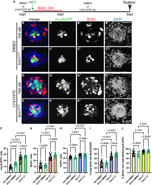 Fig. 8 Notch signaling regulates cellular proliferation during regeneration in krm1nl10 neuromasts (A) Timeline of drug exposure between 5-8dpf. DMSO or LY411575 at 5dpf for 5-h prior to NEO exposure, NEO exposure, BrdU incubation for 24 h h in the presence of DMSO or LY411575, and then regeneration to 8dpf with exposure to DMSO or LY411575. (B–E‴) Confocal projections of L2 neuromasts at 8dpf expressing Tg(myosin6b:GFP)w186 to label regenerated hair cells (myo6:GFP green), BrdU incorporation (red), and DAPI labeling of nuclei (blue) in heterozygous sibling and krm1nl10 mutant larvae following exposure to DMSO or LY411575. (F–J) Quantification of myo6:GFP-labeled hair cells at 8dpf following regeneration during exposure to DMSO or LY411575, BrdU-labeled NM cells 8dpf following regeneration during exposure to DMSO or LY411575, percentage of BrdU-positive cells/DAPI-labeled nuclei in NMs, and percentage of myo6:GFP-labeled hair cell co-labeled with BrdU. DMSO-exposed heterozygous siblings n = 22 NM (9 fish) and krm1nl10 n = 26 NM (9 fish); LY411575-exposed heterozygous siblings n = 20 NM (11 fish) and krm1nl10 n = 26 NM (9 fish). All data presented as mean ± SD, Kruskal-Wallis test, Dunn’s multiple comparisons test. Scale bar = 20 μm. See also Figure S3.