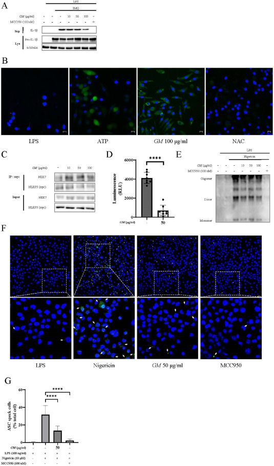 Fig. 3 GM suppresses the ATPase activity of NLRP3. (A) LPS-primed J774A.1 cells were treated with GM for 2 h and activated with imiquimod (200 μM) for 1 h. Supernatants and lysates were assessed via immunoblotting. (B) LPS-primed J774A.1 cells were treated with GM or NAC and activated with ATP (5 mM) for 10 min. ROS levels were fluorescently detected with DCF-DA solution (20 μM). (C) NLRP3-myc vector-transfected 293FT cells were treated with GM for 2 h. NEK7-NLRP3 interactions were confirmed using co-immunoprecipitation. (D) NLRP3's ATPase activity under GM treatment was determined via luminescence using an ADP-Glo assay. (E) Pellets of THP-1 cells were cross-linked using DSS (25 mM) and detected via immunoblotting. (F) LPS-primed J774A.1 cells were treated with GM for 2 h and activated with nigericin (10 μM) for 30 min. Representative immunofluorescence images of ASC speck formation were confirmed using a confocal laser-scanning microscope (Carl Zeiss, LSM710). (G) Graph showing the counts of ASC specks.