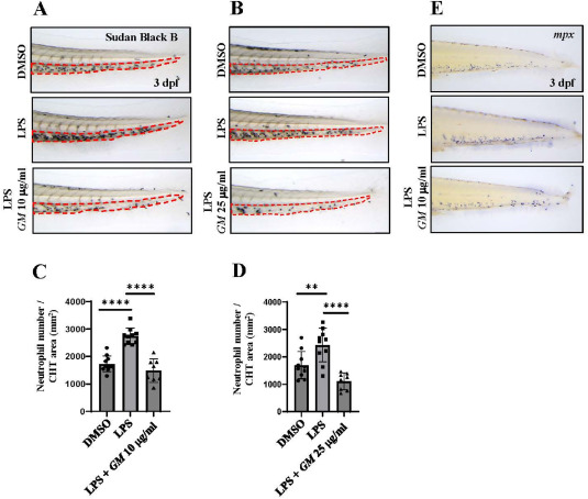 Fig. 5 GM alleviates LPS-induced inflammatory response in zebrafish. (A, B) Representative images of zebrafish embryos with Sudan Black B staining at 3 days post-fertilization (dpf). The upper panel indicates the control group with DMSO (A, DMSO 0.0025%; B, DMSO 0.0625%), the middle panel indicates the LPS-induced inflammation group (10 μg/mL), and the bottom panel indicates the LPS-induced inflammation group treated with GM (A, 10 μg/mL and B, 25 μg/mL of GM). The red dotted area indicates the CHT. (C, D) Quantification of the number of Sudan Black B-positive neutrophils in the CHT of zebrafish treated with GM after LPS-induced inflammation (C, 10 μg/mL and D, 25 μg/mL of GM). (E) Representative images of whole-mount in situ hybridization using an mpx probe in the CHT after LPS induction and GM treatment (10 μg/mL) at 3 dpf. All graphs represent the means ± SEM. of individual values. P-values were calculated using an unpaired two-tailed Student's t-test. **P < 0.01; ****P < 0.0001. (For interpretation of the references to colour in this figure legend, the reader is referred to the Web version of this article.)