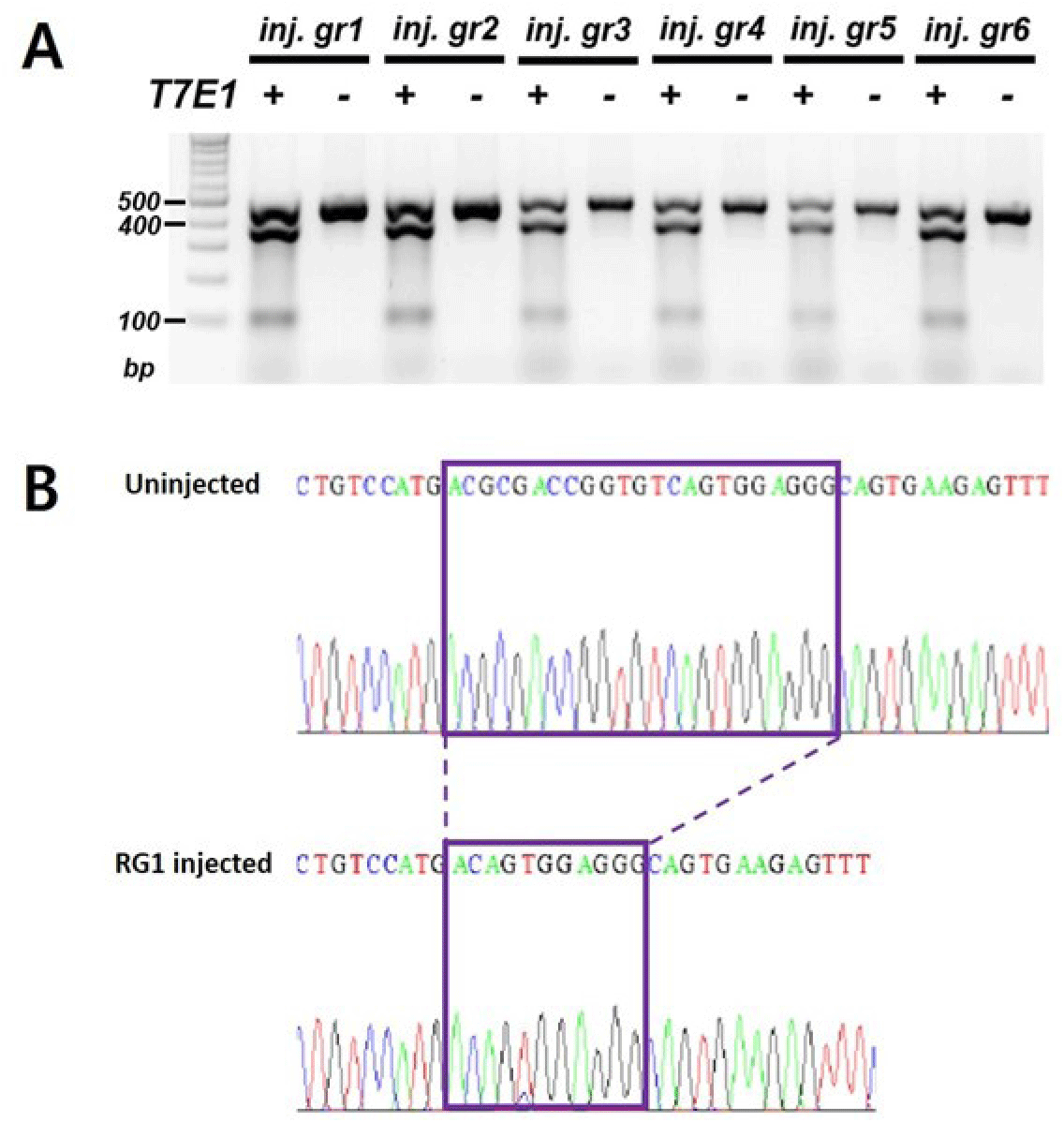 Fig. 3 Test of activity for ints14 RGEN in zebrafish. (A) To identify the efficiency of the sgRNA, we co-injected ints14 sgRNA (RG1) and Cas9 protein. Co-injected embryos showed that the sgRNA efficiently generated mismatched DNA when the T7 endonuclease I (T7E1) assay was performed. (B) The TA-cloning and sequencing results demonstrate that a deletion of approximately 12 bp can be achieved via the RGEN system.
