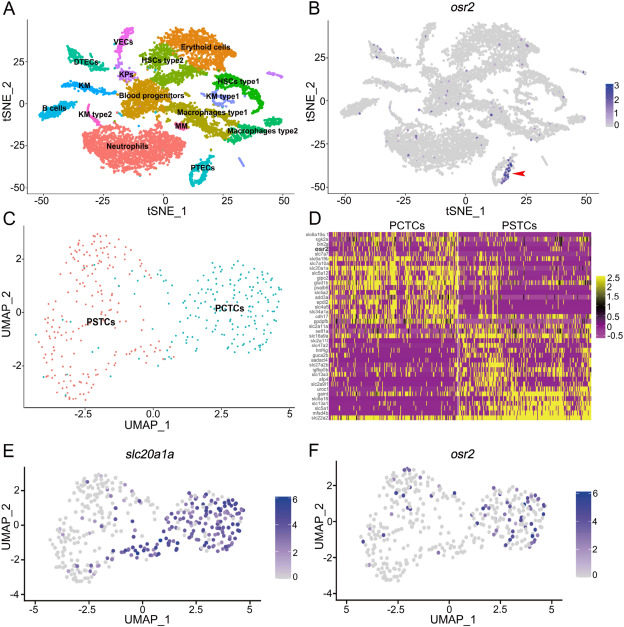 Fig. 1 Expression pattern of osr2 in zebrafish kidney. A-B: scRNA-seq analysis showed that osr2 was expressed in PTECs. tSNE plots show zebrafish kidney cell clusters and the expression of osr2. HSCs, hematopoietic stem cells; KPs, Kidney progenitors; KM, Kidney Multiciliated; MM, Macrophages Myeloid; KM, Kidney mucin; VECs, Vascular endothelium cells; DTECs, distal tubule epithelial cells; PTECs, proximal tubule epithelial cells. C: Cluster DTECs was divided into PSTCs and PCTCs subpopulations. D: Heatmap shows relative log-expression of some genes in PCT or PST in C. E-F: Expression analysis of slc20a1a and osr2 in each subpopulation. PCTCs, proximal convoluted tubule epithelial cells; PSTCs, proximal straight tubule epithelial cells.
