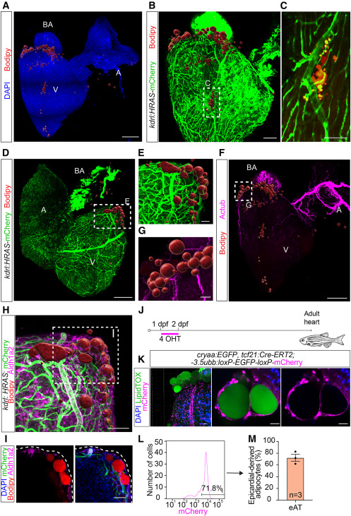 Fig. 1 Anatomical localization, subtissular niche, and epicardial origin identify a zebrafish cardiac fat depot equivalent to the mammalian eAT (A) Zebrafish eAT localizes mainly at the anterior pole of the heart. Shown is a confocal image of an adult zebrafish heart stained with BODIPY 558/568 C12 to detect lipids (adipocytes) and DAPI. Scale bar, 200 μm. (B and C) Zebrafish eAT is in contact with major coronary vessels. (B) A kdrl:Has.HRAS-mCherry zebrafish heart, immunostained for mCherry and stained with BODIPY 558/568 C12. Scale bar, 100 μm. (C) Enlargement of the boxed area in (B). Scale bar, 50 μm. (D and E) Vascularization of zebrafish eAT by underlying coronary vessels. (D) A kdrl:Has.HRAS-mCherry zebrafish heart, immunostained for mCherry and stained with BODIPY 558/568 C12. Scale bar, 200 μm. (E) Enlargement of the boxed area in (D). Scale bar, 50 μm. (F and G) Zebrafish eAT is highly innervated. (F) Heart immunostained for acetylated tubulin (Actub). Adipocytes were visualized with BODIPY 558/568 C12 staining. Scale bar, 200 μm. (G) Digitally traced nerves from the boxed area in (F). Scale bar, 50 μm. (H and I) The fat depot is located underneath the epicardium. (H) Adult kdrl:Has.HRAS-mCherry zebrafish heart, immunostained for the epithelial marker Aldh1a2 and mCherry. Adipocytes were visualized with BODIPY 558/568 C12 staining. Scale bar, 50 μm. (I) A single confocal plane of the boxed region in (H). Scale bar, 50 μm. (J and K) Epicardial origin of zebrafish eAT. (J) Schematic of the epicardial linage tracing approach. 4-OHT-mediated induction of Cre recombination in tcf21:Cre-ERT2; ubb:loxP-EGFP-loxP-mCherry fish at 1–2 days post fertilization (dpf) enabled labeling of cells derived from tcf21+ proepicardial cells in the adult heart. (K) Epicardium-derived cells were visualized by mCherry immunostaining and adipocytes by LipidTOX. DAPI labeled all cell nuclei in the heart. Scale bar, 20 μm. (L) Representative flow cytometry plot showing distribution of tcf21:Cre-ERT2 traced cells by mCherry fluorescence intensities. (M) Graph showing average percentage of mCherry+ epicardium-derived adipocytes in the zebrafish heart. V, ventricle; A, atrium; BA, bulbus arteriosus. Adipocytes in (A), (B), and (D)–(H) are shown as 3D surface-rendered objects. All images represent observations from 3 animals per group.