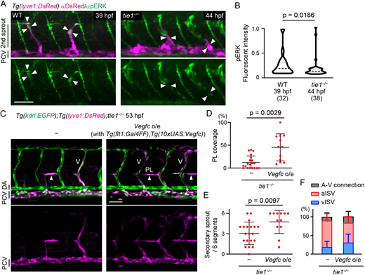 Fig. 7 Tie1 regulates lymphatic development at least in part through the modulation of Vegfc/Vegfr3 signaling. (A) Whole-mount immunofluorescence staining for pERK (green) and DsRed (magenta) in WT and tie1−/− Tg(lyve1:DsRed) embryos. Arrowheads point to EC nuclei of secondary sprouts assessed by the DAPI staining. Secondary sprouts migrate towards the HM around 39 hpf in WT and 44 hpf in the tie1 mutant. (B) Quantitative analyses of the data shown in A. Fluorescence intensity of nuclear pERK staining (DAPI+ area, not shown in A) was quantified in the lyve1:DsRed+ ECs budding from the PCV of WT (39 hpf) and tie1−/− (44 hpf) embryos. Data are mean±s.d. (WT, n=32 ECs in 5 embryos; tie1−/−, n=38 ECs in 7 embryos). (C) Trunk of Tg(kdrl:EGFP);Tg(lyve1:DsRed) tie1−/− embryos with or without Tg(flt1:Gal4FF);Tg(10×UAS:vegfc) (53 hpf). Formation of PLs (arrowheads) and venous ISVs (V) are partially recovered by overexpression (o/e) of Vegfc in the tie1 mutant. (D) Percentage of PL coverage at 54 hpf. Data are mean±s.d. (tie1−/−, n=20 embryos; tie1−/− with Vegfc o/e, n=12 embryos). (E) Number of secondary sprouts scored across six segments at 54 hpf. Data are mean±s.d. (tie1−/−, n=20 embryos; tie1−/− with Vegfc o/e, n=12 embryos). (F) Number of A-V connections across six segments at 54 hpf. Data are mean±s.d. (tie1−/−, n=20 embryos; tie1−/− with Vegfc o/e, n=12 embryos). Scale bars: 50 μm. P-values were determined by two-tailed Mann–Whitney test (B) and by two-tailed Student's t-test (D,E).