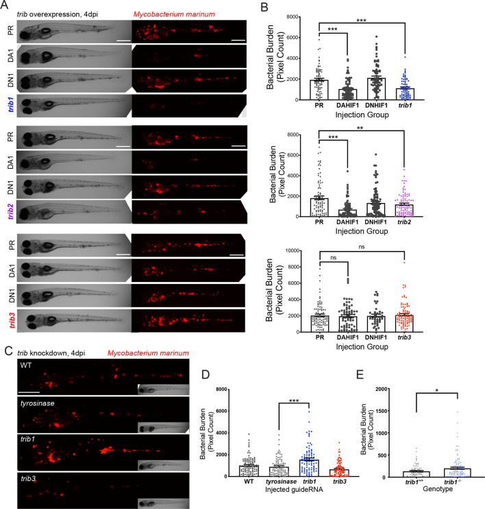 Figure 4 trib1 overexpression is host protective against Mm infection. (A) Stereo-fluorescence micrographs of Mm mCherry infected 4 dpi larvae after injection at the single-cell stage with dominant active hif-1α (DA1), dominant negative hif-1α (DN1), trib1, trib2, trib3 RNAs and phenol red (PR) as a negative vehicle control. DA1 and DN1 are RNA controls with DA1 having previously been shown to reduce infection levels (Elks et al., 2013). Scale bar = 200 µm. (B) Bacterial burden of larvae shown in (A). Data shown are mean ± standard error of the mean (SEM), n = 76–77 in trib1, n = 86–89 in trib2, and n = 43–95 in trib3, accumulated from three independent experiments for each trib gene. Statistical significance determined via one-way analysis of variance (ANOVA) with Bonferroni’s multiple comparisons. p values shown are: **p < 0.01 and ***p < 0.001. (C) Stereo-fluorescence micrographs of Mm mCherry infected 4 dpi larvae after injection with tyrosinase (control), trib1 and trib3 CRISPR guides (CRISPants). Scale bar = 200 µm. (D) Bacterial burden of larvae shown in (C). Data shown are mean ± SEM, n = 87–90 fish accumulated from three independent experiments. Statistical significance determined via one-way ANOVA with Bonferroni’s multiple comparisons. p values shown are: ***p < 0.001. (E) Bacterial burden of trib1−/− stable knockout larvae compared to wildtype (trib1+/+) siblings. Data shown are mean ± SEM, n = 82–114 fish accumulated from four independent experiments. Statistical significance determined via an unpaired t-test. p values shown are: *p < 0.05.